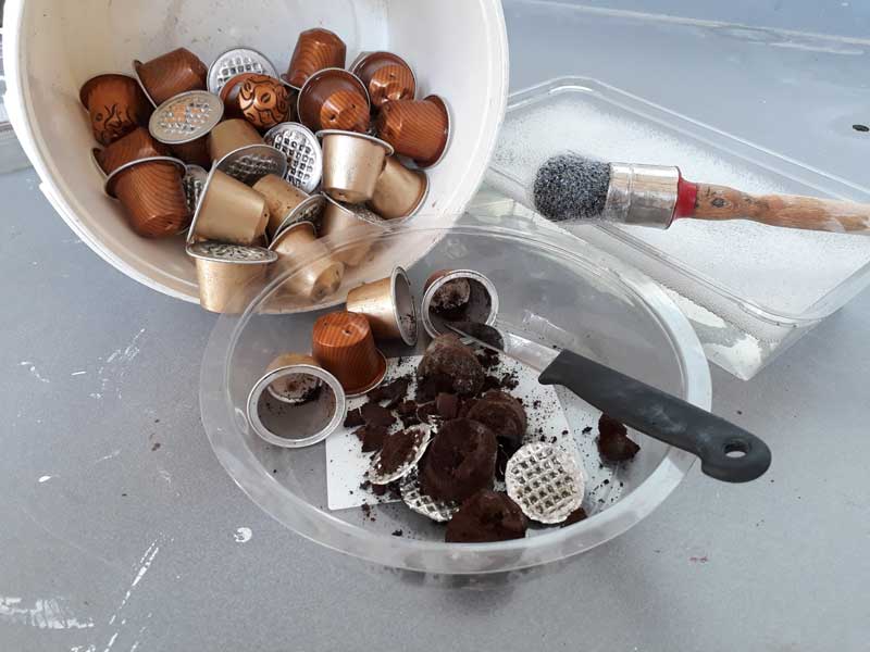cupjes openen; koffie eruit en cupjes schoonborstelen